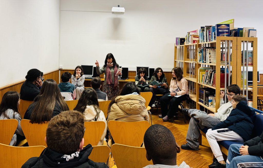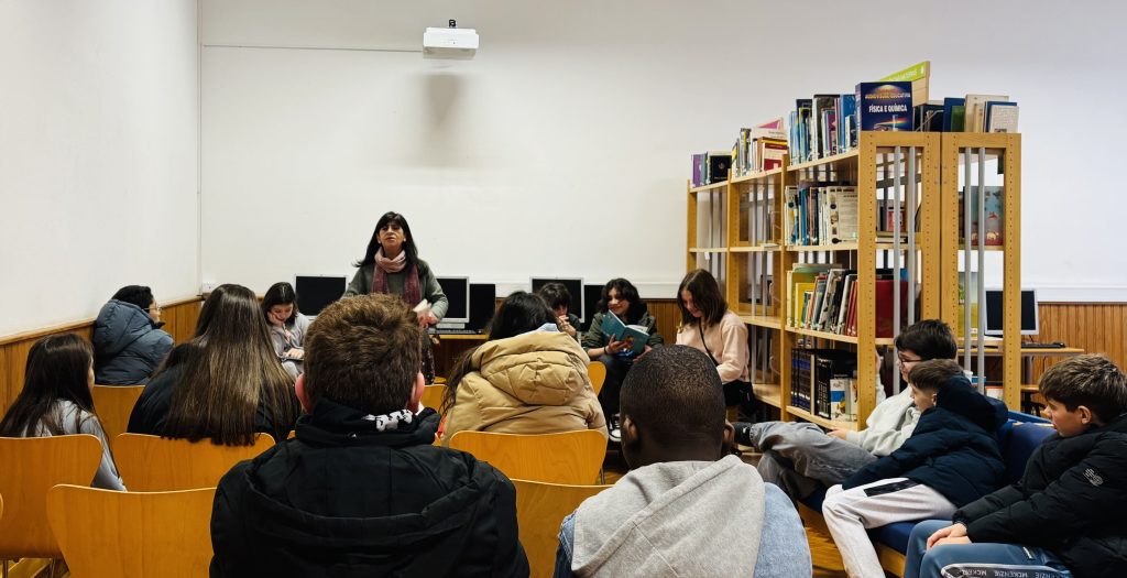 No âmbito do Clube “Arte com Letras” e da atividade “Livros vivos – histórias que ganham voz”, a biblioteca escolar acolheu (08.01.2026) mais uma sessão da Hora do Conto, orientada pela professora Cristina Santos, dirigida às turmas do 2.º ciclo, desta vez dedicada à obra infantil Ulisses, de Maria Alberta Menéres.